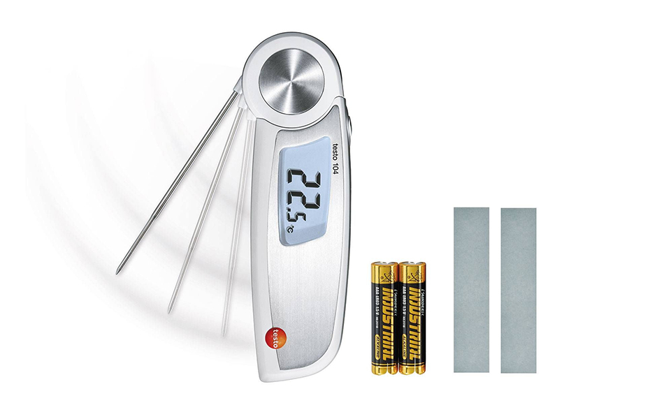 testo 104在測量完成后可水下沖洗的折疊式食品中心溫度計。折疊式探頭在完成測量后折疊收納入儀器外殼。