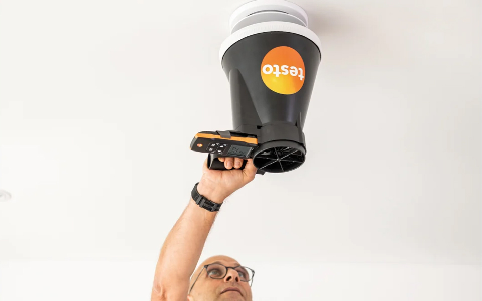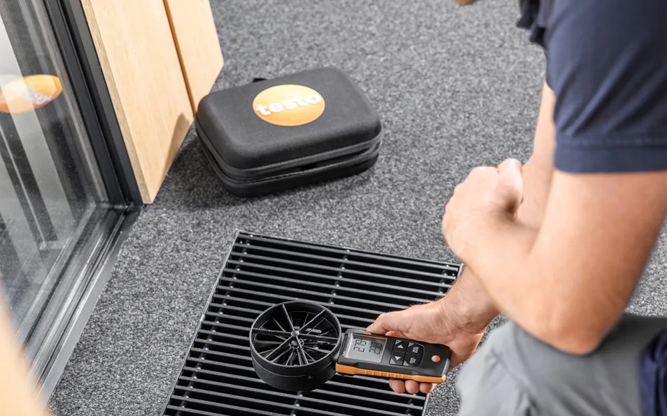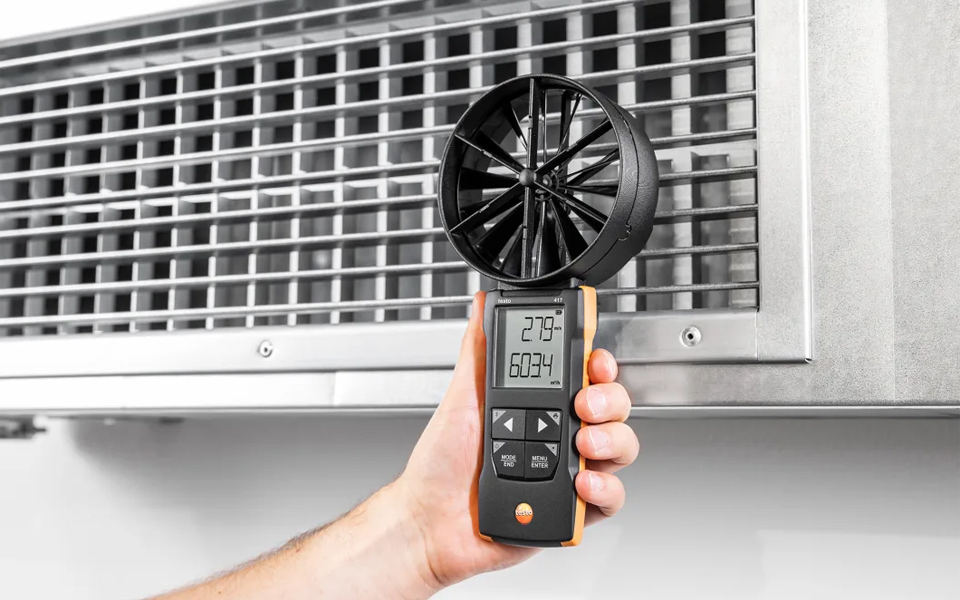 使用 testo 417葉輪風(fēng)速計(jì),快速、精確測量空調(diào)和通風(fēng)系統(tǒng)進(jìn)風(fēng)口和排風(fēng)口的風(fēng)速風(fēng)量、溫度。可選配風(fēng)量罩和輔助風(fēng)管,有助于檢測格柵出風(fēng)口和風(fēng)閥處的風(fēng)量。時(shí)間段和多點(diǎn)平均值以及風(fēng)量自動(dòng)計(jì)算并顯示在屏幕上。