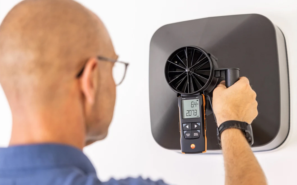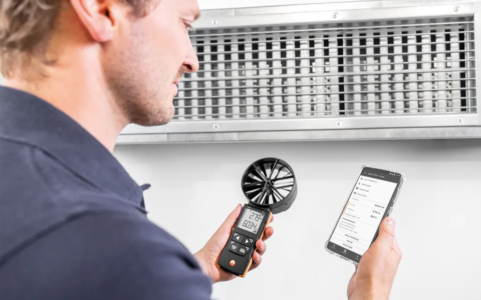 testo 417葉輪風(fēng)速計(jì),快速精確地測量空調(diào)和通風(fēng)系統(tǒng)進(jìn)風(fēng)口和出風(fēng)口風(fēng)速風(fēng)量。有效調(diào)節(jié)住宅平衡通風(fēng),并使用testo Smart APP快速地記錄。
