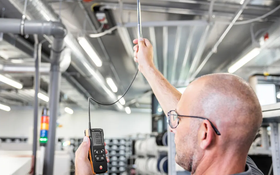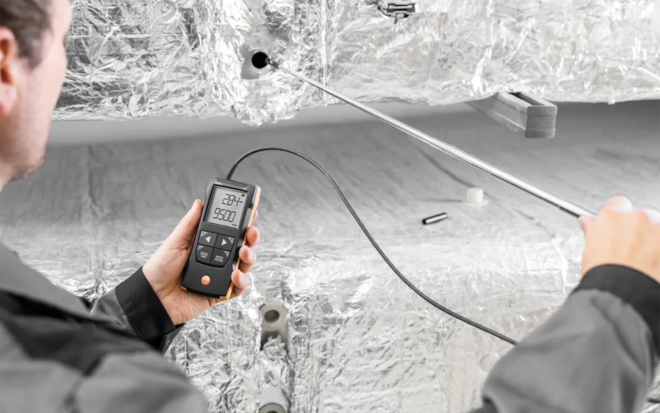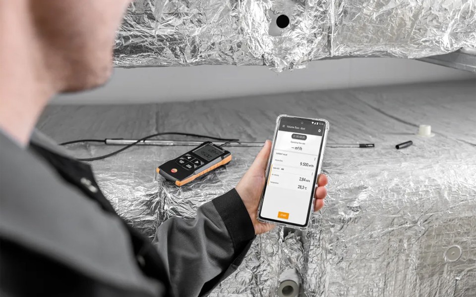 testo 417葉輪風速計,快速精確地測量空調和通風系統進風口和出風口風速風量。有效調節住宅平衡通風,并使用testo Smart APP快速地記錄。